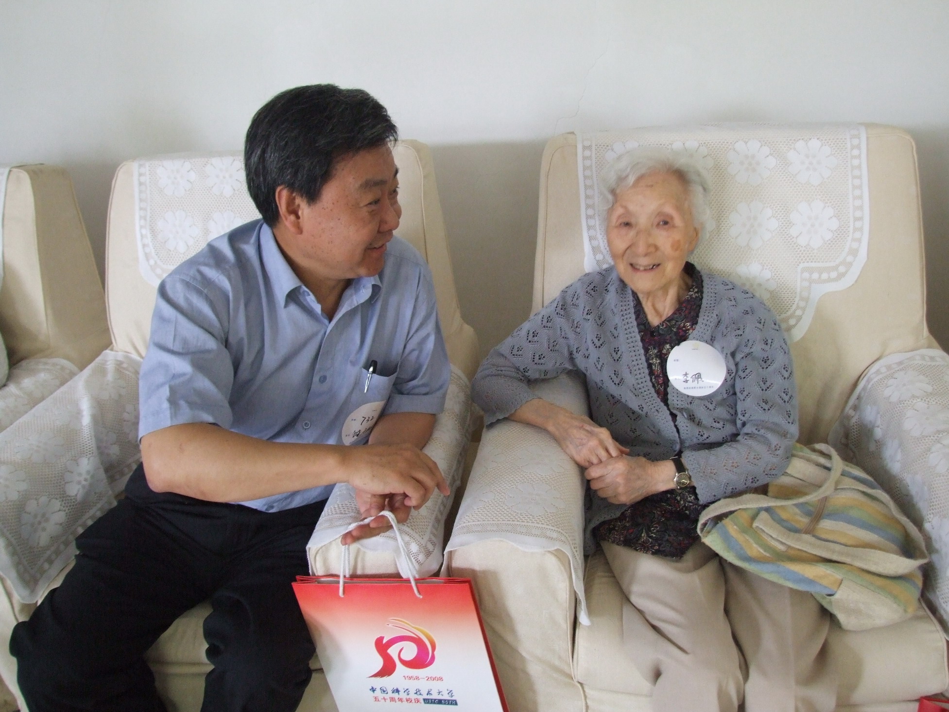 李佩教授满头银发,她不要学生志愿者帮助,坚持亲自拎着校庆纸袋。(摄影:冯侦探)