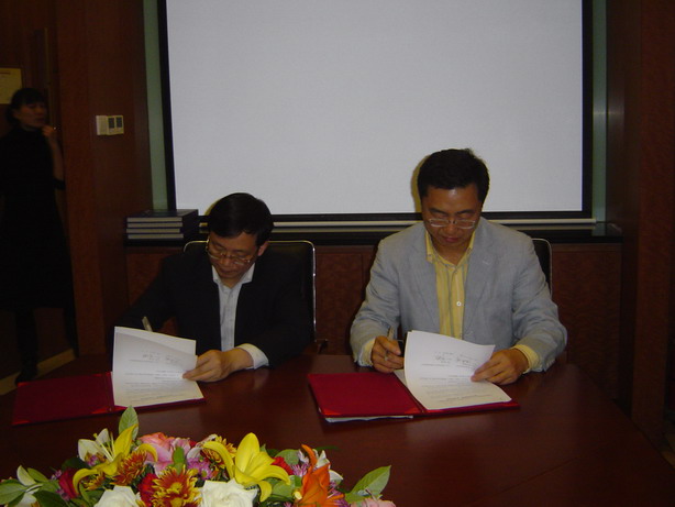 侯建国校长(前排左)与郭元林(前排右)签署《“新创讲席教授”补充协议书》。后排左起许四清、吴亦兵、蒋澄宇、周全、马扬。